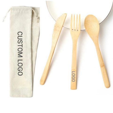 Set alat makan kayu bambu, dapat digunakan kembali berkemah perjalanan sendok garpu Set pisau sendok garpu dengan tas kain ramah lingkungan sendok pisau garpu